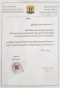 وزارة الاقتصاد والصناعة: يمنع على الصاغة مزاولة مهنة الصرافة بكافة أشكالها، وقد حددت مزاولة مهنة الصرافة ضمن مكاتب الشركات المرخصة لدى مصرف سورية المركزي، كما يمنع ازدواجية العمل بالصياغة والصرافة للمرخصين في مكتب واحد تحت طائلة المساءلة القانونية.